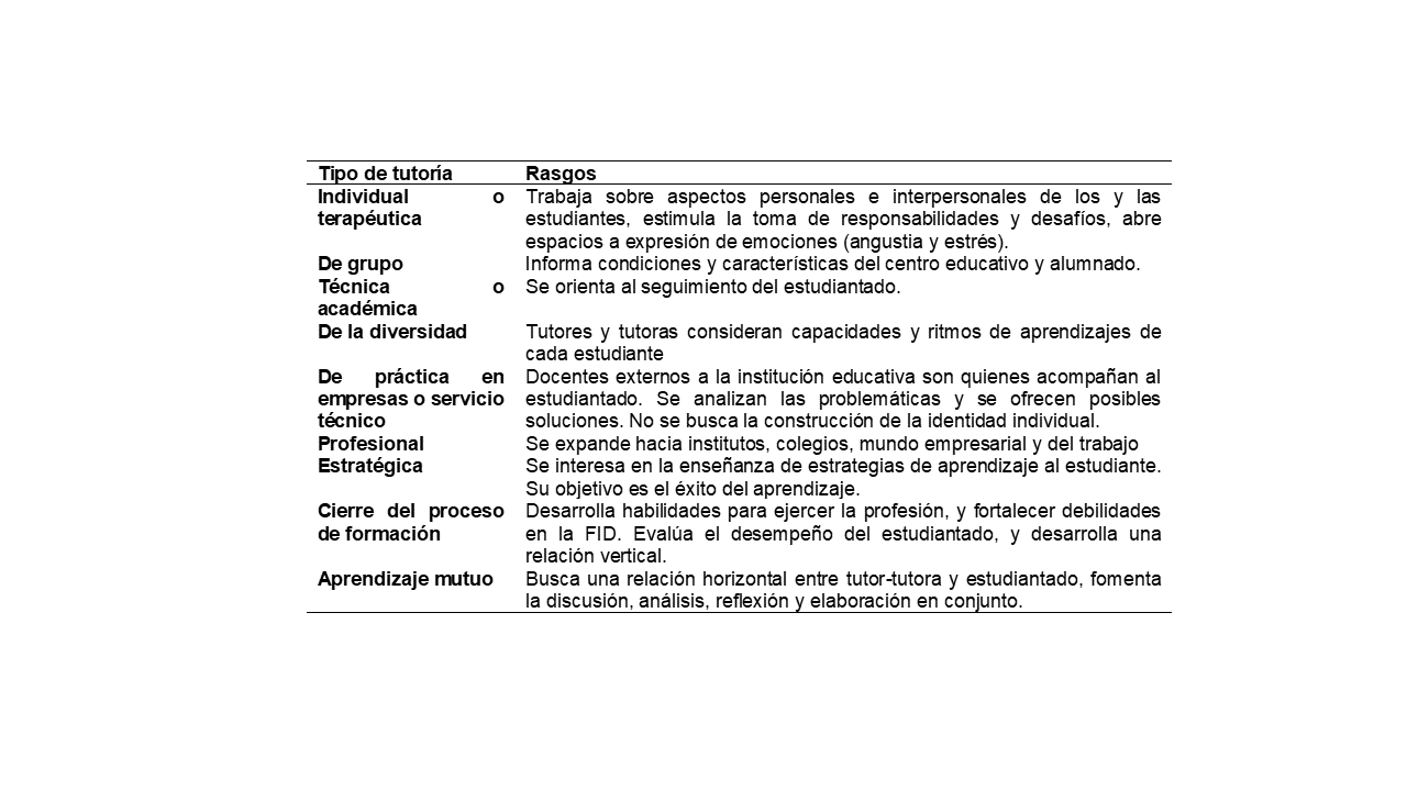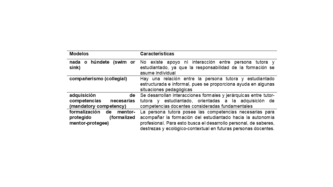 Se han planteado modelos de tutorías, que dan cuenta de los rasgos del acompañamiento que pueden desarrollar tutores o tutoras en la relación con las futuras personas docentes que acompañan. Respecto a esto, en la Tabla 2 se sistematiza modelos de tutorías y sus principales características.
