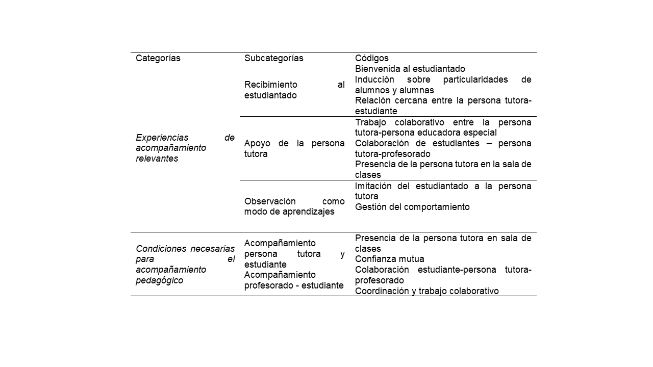 Los resultados de este estudio corresponden a las categorías experiencias relevantes de acompañamiento y condiciones necesarias para el acompañamiento pedagógico[7]. Estas dimensiones surgen desde el análisis sobre la experiencia del estudiantado en práctica pedagógica de último año de formación. Las categorías se organizan en subcategorías y códigos que interpretan temáticamente la experiencia de acompañamiento vivida por el estudiantado (ver Tabla 4).