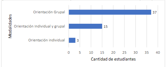 Del estudiantado que respondió que sí había recibido orientación vocacional en la secundaria (55 participantes), se observa que fue mediante la modalidad de Orientación grupal, ya que en el curriculum del Ministerio de Educación Pública se cuenta con un espacio para brindar lección de Orientación.