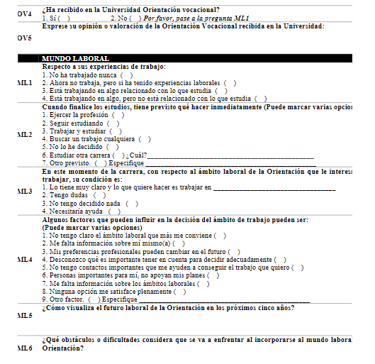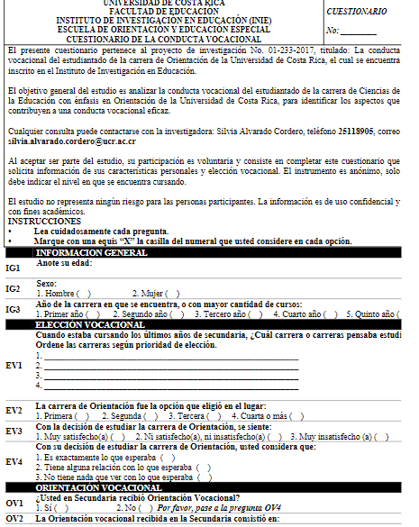 El cuestionario utilizado (Anexo 1) se dividió en cinco apartados: Información General, Elección vocacional, Orientación Vocacional, Mundo laboral e Influencia Vocacional. Este instrumento fue elaborado a partir de los planteamientos teóricos y los objetivos del estudio. Igualmente, fue validado por un grupo de estudiantes de la carrera, quienes realizaron sugerencias de modificaciones en la redacción, las cuales permitieron una mejor comprensión de la información solicitada. Cabe mencionar que, en la elaboración y diseño del cuestionario, se contó con la asesoría de la persona especializada en estadística del INIE.