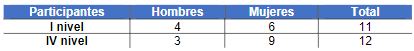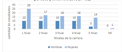 Como se muestra en la Figura 1, se logró representación de todos los niveles: de primero a cuarto nivel corresponden al Bachillerato, y el quinto nivel, a la licenciatura en Ciencias de la Educación con énfasis en Orientación. Del estudiantado participante, la mayor cantidad son mujeres. Llama la atención que en los niveles I, II, III y IV participó la misma cantidad de hombres.