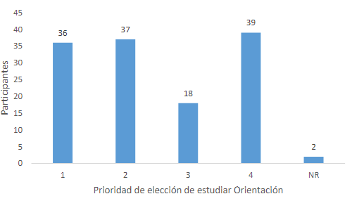 En la Figura 3 se observa que al consultar al estudiantado acerca de su decisión de estudiar la carrera de Orientación, 36 estudiantes manifestaron que Orientación la tenían como primera alternativa y 37 como segunda, lo que representa que para más del 50% fue su interés inicial.
