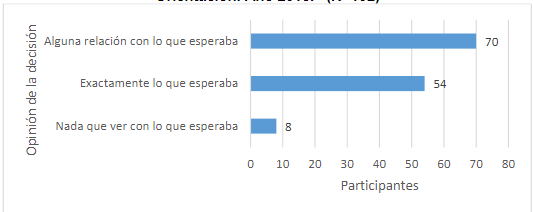 En la consulta realizada al estudiantado de los diferentes niveles, se preguntó acerca de la opinión con respecto a lo que esperaba de la carrera de Orientación. En la Figura 4 se observa que 124 estudiantes respondieron que se relaciona parcial o totalmente con lo que esperaban, lo que permite inferir que previo al ingreso accedieron a información de la carrera de Orientación. Un mínimo de estudiantes opinó que la carrera de Orientación no tenía ninguna relación con sus expectativas al ingresar.