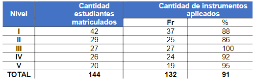 Como se observa en la Tabla 3, en la consulta cuantitativa se logró una alta participación del estudiantado, con 132 respuestas de todos los niveles de la carrera de Orientación. Destaca que en el III nivel respondió el 100% del estudiantado. Se logró recolectar información del 91% del estudiantado de la carrera.