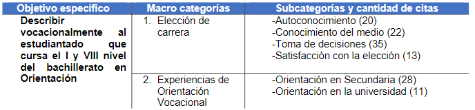 En este apartado se presentan los resultados cuantitativos y cualitativos. En primera instancia se incluyen los resultados de los grupos focales e información posterior del cuestionario aplicado a todo el estudiantado de la carrera. En segunda instancia, con respecto al objetivo de describir vocacionalmente al estudiantado que cursa el I y VIII nivel del bachillerato en Orientación, se presentan dos categorías y sus respectivas subcategorías. A continuación, se describen las categorías: elección de carrera y experiencias con orientación vocacional.
