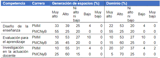 Respecto al grado de dominio de la competencia, en ambas carreras la dispersión es similar, entre Ni alto Ni bajo a Muy alto. En PMM hay una mayor percepción entre Alto y Muy alto (92%) con la moda en Alto (57%); mientras que en PMCNyB la percepción entre Alto y Muy alto es un poco menor (80%), donde la moda se ubica en la categoría Muy alto (50%).