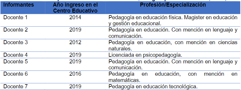 La selección de las personas entrevistadas se determinó a través de un muestreo intencional que define un conjunto de criterios de elección para establecer quienes serán parte del estudio (Duque y Aristizábal, 2019, p. 8). Los criterios de selección aplicados fueron: Personal docente con grado académico de licenciatura en educación; con una experiencia mínima de dos años en el ejercicio de profesor o profesora en los colegios seleccionados de la zona norte de Arica; poseer una jornada completa de clases dentro de los colegios elegidos y desarrollar su labor pedagógica en cursos con estudiantes inmigrantes.