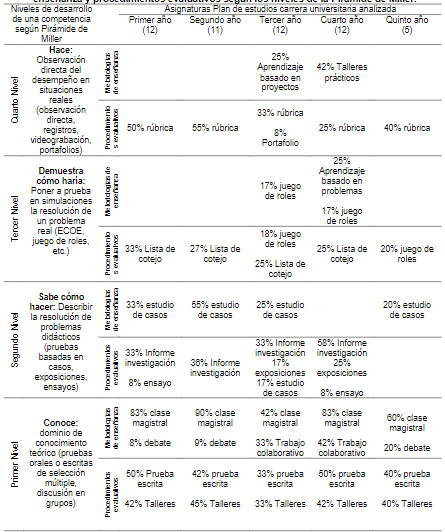 Así, la tabla 1 demuestra la mayor concentración de metodologías de enseñanza y procedimientos evaluativos en el primer y segundo nivel de la formación de competencias según la Pirámide de Miller, especialmente mediante clase magistral y prueba escrita respectivamente, concentradas en su mayoría en el primer nivel de la Pirámide.