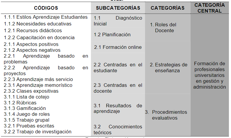 A partir del caso analizado, la tabla 2 identifica tres grandes categorías de análisis relacionadas con la formación de profesionales universitarios en el ámbito de la gestión y la administración, desagregadas en subcategorías y tópicos identificados a partir de los relatos de las experiencias docentes y estudiantiles recabadas durante el estudio.