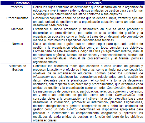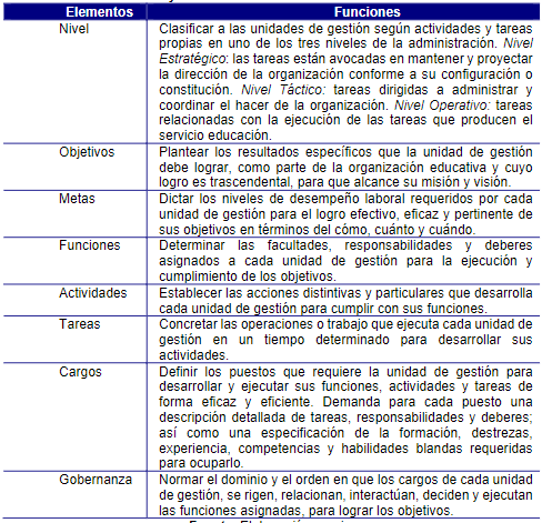 Las unidades de gestión dentro de una organización educativa según sus funciones, actividades y tareas (Fayol, 1916; Drucker,1954) pueden recibir diferentes denominaciones: comisión, comité, consejo, departamento, dirección, junta y subdirección, entre otros. En la Tabla 5 se identifican los elementos de esta sección y sus funciones.