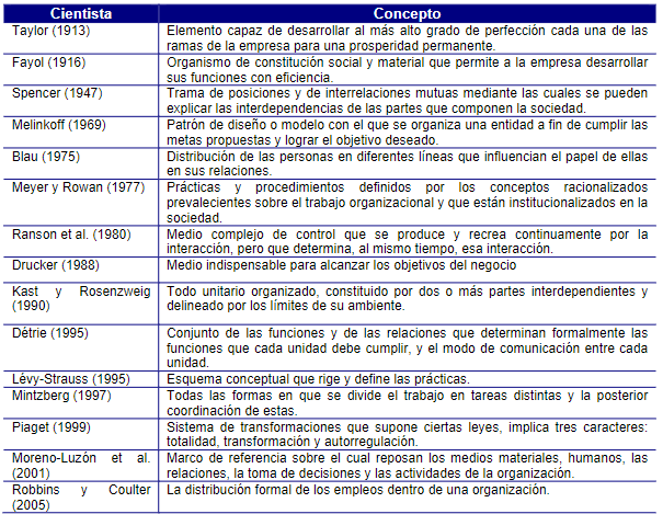 Desde el ámbito de la de la teoría de la organización y de la administración, el concepto de estructura ha asumido diferentes definiciones. La Tabla 1 presenta una síntesis de los principales enunciados conceptuales, que connotados cientistas en el campo de la administración, han planteado con respecto al concepto.