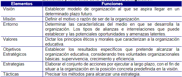 La sección de configuración tiene por propósito establecer el fin (Drucker,1954), el segmento estratégico (Détrie, 1993) y el entorno de la organización educativa (Mintzberg, 1979; Détrie, 1993) para constituir su razón de ser, en virtud de la cual debe gravitar el diseño de la estructura para su logro. En la definición de este fin, debe considerarse que la educación es un bien social, al que todas las personas tienen derecho y, por lo tanto, debe garantizárseles su acceso. Es a través de ella, que la comunidad política satisface sus demandas de orden social y económico. Los elementos de esta sección y sus funciones se analizan en la Tabla 4.
