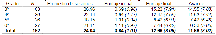 Además del análisis de correlación, se practicó un análisis de regresión lineal múltiple en el que se intentó predecir la ganancia en el programa con las variables de edad, grado escolar y número de sesiones al que asistieron. Se utilizó el método paso a paso (stepwise): El mejor modelo alcanzado explica el 21,9 % de la varianza (F (2,168) = 25.92, p < .001, R2 = .22 R2ajustado = .21). Ese modelo incluye el grado (B = -0.35, t(187) = -5.30, p < .001) y el número de sesiones (B = 0.24, t(187) = 3.57, p < .001). Se descarta a la edad como variable predictora. El modelo informa que el grado realiza una contribución negativa. A mayor avance en el grado escolar, menor es la ganancia obtenida en la intervención. Esa variable explica un 16.5 de la varianza. Una vez controlado el efecto del grado, el número de sesiones a las que asisten las niñas y los niños explica un 5,4 % adicional de la varianza.