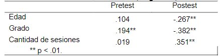 Con el propósito de explorar con mayor profundidad la relación entre el dominio de la escritura y las variables edad, grado y cantidad de sesiones, se calcularon las correlaciones mediante el método de rangos de Spearman. Los resultados de este análisis, presentes en la Tabla 2, mostraron una correlación significativa y positiva entre el desempeño en el pretest y el grado s. Es decir, en los grados más avanzados, el grupo infantil pudo escribir inicialmente más palabras. Por otro lado, la correlación del desempeño en el pretest y la edad no resultó estadísticamente significativa.