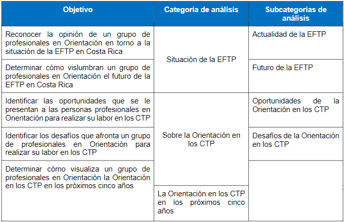 Si bien, las personas responsables de esta investigación no comparten en su totalidad lo que se afirma, dado que se deja de lado otras variables que influyen en la situación a la que se hace referencia, como la oferta de las especialidades y las oportunidades laborales, entre otras; se plantea la posibilidad de indagar al respecto. Para ello, se parte del objetivo, conocer las perspectivas en torno a la Orientación en la ETFP del MEP, de un grupo de profesionales en Orientación que laboran en este tipo de instituciones, específicamente, en cuanto a los desafíos y oportunidades, a las cuales pueden hacer referencia desde su experiencia laboral en esta modalidad educativa y, con ello, continuar contribuyendo desde la Orientación a que los Colegios Técnico Profesionales (CTP) puedan cumplir los fines que originaron su creación, atender las necesidades tanto del estudiantado como las del mundo laboral y, de esta manera, promocionar el bienestar personal y social.