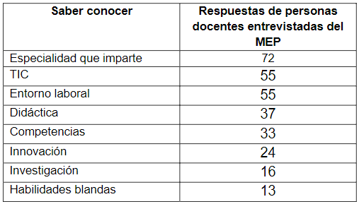 Por otro lado, las personas docentes expresaron los resultados de los saberes esenciales que se obtuvieron por medio de preguntas abiertas, por lo que se recurre a la herramienta QDA Miner Lite para el procesamiento de datos. En este sentido, las personas encuestadas expresaron que los conocimientos deben centrarse en aquellos relacionados con la especialidad técnica que imparten, en las tecnologías de la información y la comunicación (TIC) (este aspecto se menciona también en el “saber hacer”, ya que indica que deben conocer dichas tecnologías para, luego, poder ponerlas en práctica), el entorno laboral que se refiere a las características del contexto donde, eventualmente, puede insertarse la persona estudiante, la didáctica que implica la selección de las técnicas y métodos de enseñanza adecuados para dirigir, orientar y facilitar el proceso de aprendizaje acorde con las características de la educación técnica, las competencias entendidas como aquellas capacidades que la persona estudiante debe poseer para el ejercicio laboral, la innovación que se refiere a la introducción de prácticas, métodos, tecnologías, enfoques pedagógicos, entre otros aspectos novedosos que buscan mejorar la calidad de la educación. Con respecto a los conocimientos relacionados con la investigación se refieren a aquellos que impliquen poder llevar a cabo dichos procesos para la mejora del proyecto educativo. Finalmente, se mencionó el conocimiento en habilidades blandas para determinar cuáles son y cómo se pueden fomentar en el estudiantado. A continuación, se presenta la Tabla 1 con la frecuencia de codificación del “saber conocer” que, de acuerdo con Quesada, Cedeño y Zamora (2015, p. 98) se refiere a la “capacidad para comprender, describir, interpretar y transformar la realidad”.