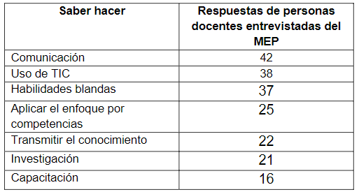 En relación con el “saber hacer”, que, de acuerdo con Quesada, Cedeño y Zamora (2015, p. 98) se refiere a las “competencias que capacitan para poner en práctica los conocimientos adquiridos”, las personas encuestadas indican que les es necesario desarrollar habilidades para mejorar la forma en la cual comunican los conocimientos sobre la especialidad técnica, así como en el uso de herramientas tecnológicas. También, consideran pertinente saber cómo fomentar las habilidades blandas en las personas estudiantes, así como poner en práctica metodologías de investigación. Además, indicaron la necesidad de aplicar el enfoque por competencias correctamente. A continuación, se presenta la Tabla 2 con los resultados obtenidos sobre este saber.