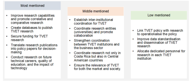 The opinions provided highlight several key points regarding the development of TVET in Costa Rica and the associated needs for research: incipient development and lack of coordination and dissemination, limited correlation between universities and the MEP, inconsistent research efforts and lack of cohesion, potential for improvement, and utilisation of untapped opportunities, and need for greater promotion of applied research.