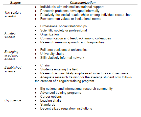It should be noted that the development of scientific disciplines is associated with specific achievements. These include university chairs, a repertoire of methodological and theoretical standards, promotion of young researchers, and academic journals. At the same time, it should be pointed out that the institutionalisation of science and its disciplines is closely linked to these facets. Which specific factors favour and promote institutionalisation can be visualised in the following chapter with the five stages of institutionalisation of science according to Clark (1972).
