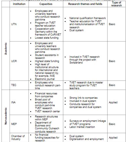 Furthermore, considering the data collected in the interviews, we can show aspects that can be described with regard to the institutions, their capacities, and their networking in TVET research in Costa Rica.