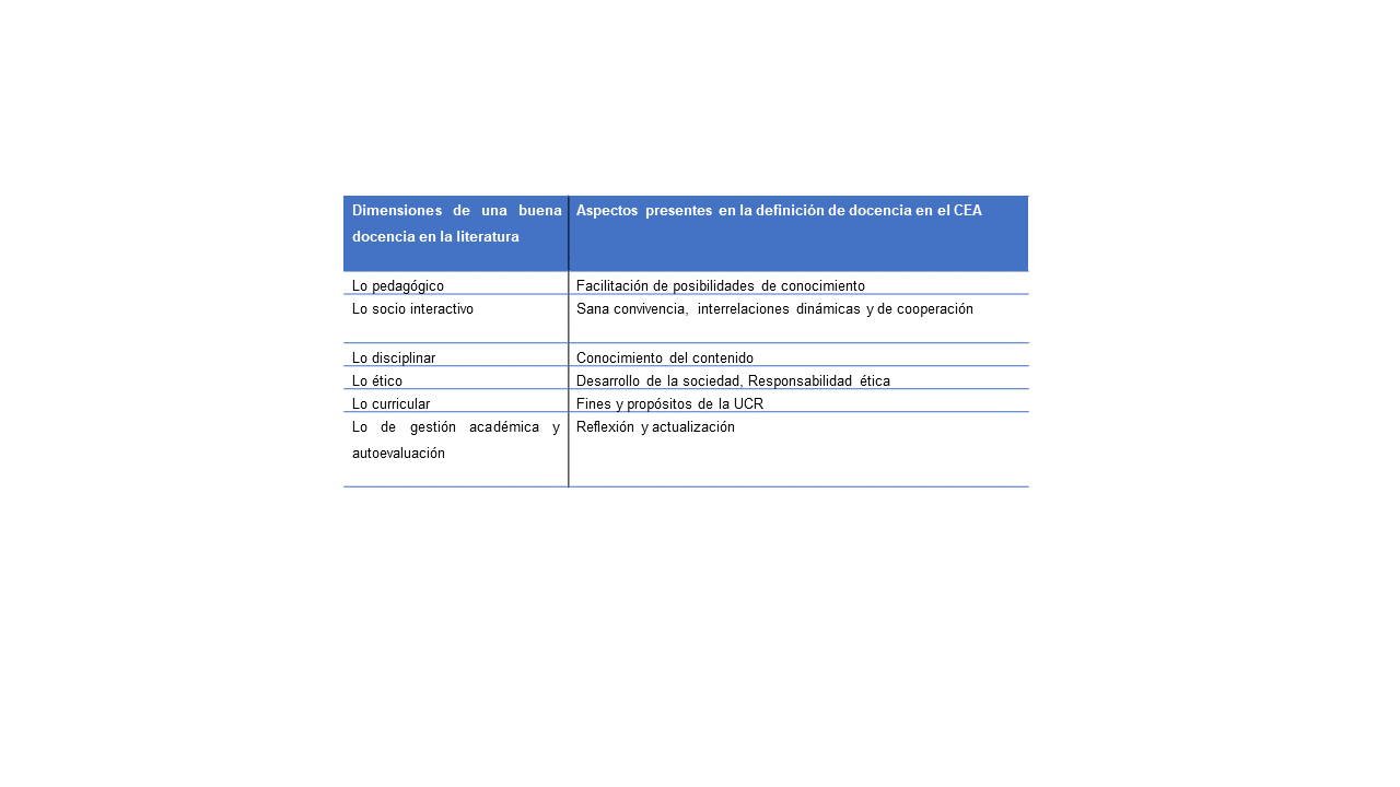 El constructo de docencia universitaria incorpora otros elementos que deberían caracterizar al profesorado de la UCR, detallados en la tabla 1, tales como conocimiento del contenido, que es abordado en la literatura también; facilitación de posibilidades de conocimiento, que es discutido en la literatura en lo pedagógico; reflexión y actualización, que son mencionadas por los autores dentro de la gestión académica y de autoevaluación; responsabilidad ética, que también señala la literatura; y la sana convivencia, interrelaciones dinámicas y de cooperación que es abordada en la teoría por la categoría de lo socio interactivo. En la tabla 1 que se presenta a continuación se resume tal comparación.