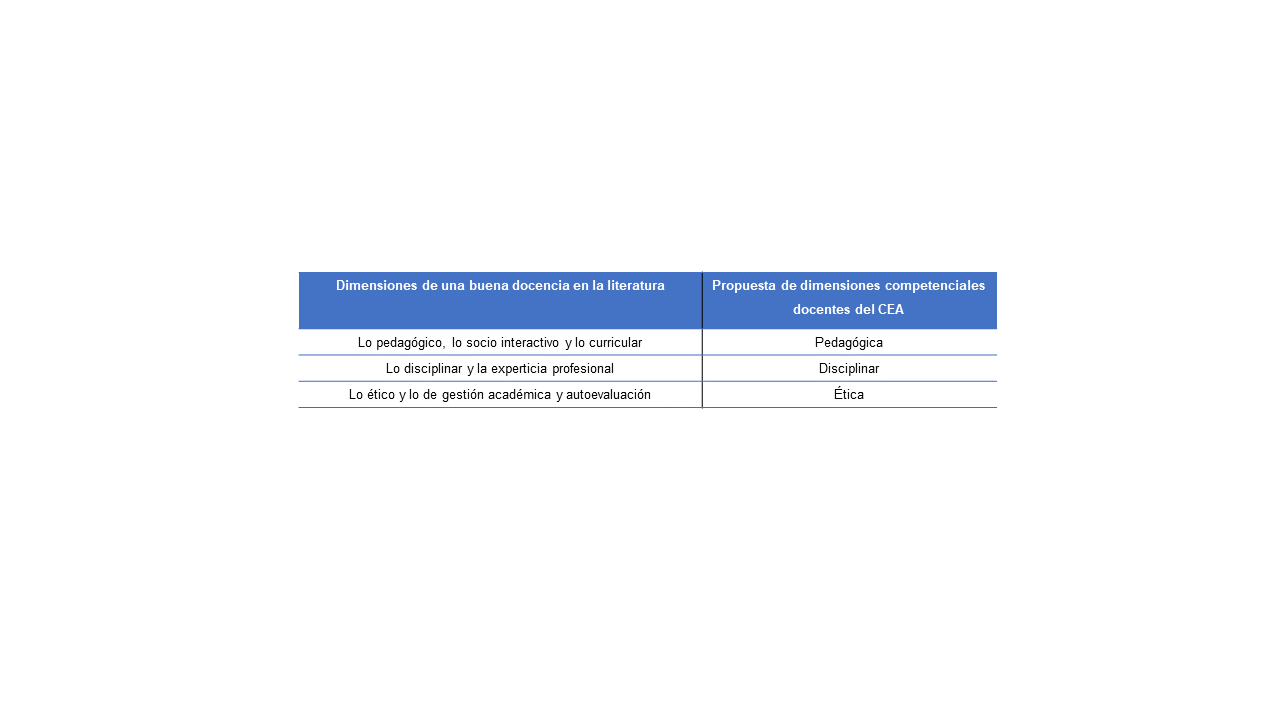 Ahora bien, al comparar las categorías encontradas en la literatura consultada con las dimensiones competenciales docentes propuestas por el CEA en este documento, se puede notar que, todas las dimensiones de la literatura están contenidas en alguna de las dimensiones del CEA, pero al ser estas últimas más amplias incluyen a otras, como por ejemplo, la dimensión pedagógica propuesta por el CEA incluye lo pedagógico, lo socio interactivo y lo curricular; la ética incluye no solo aspectos éticos sino cuestiones de gestión académica y de autoevaluación; y la disciplinar incluye desempeños referidos a la experticia profesional, tal y como se puede detallar en la tabla 2.