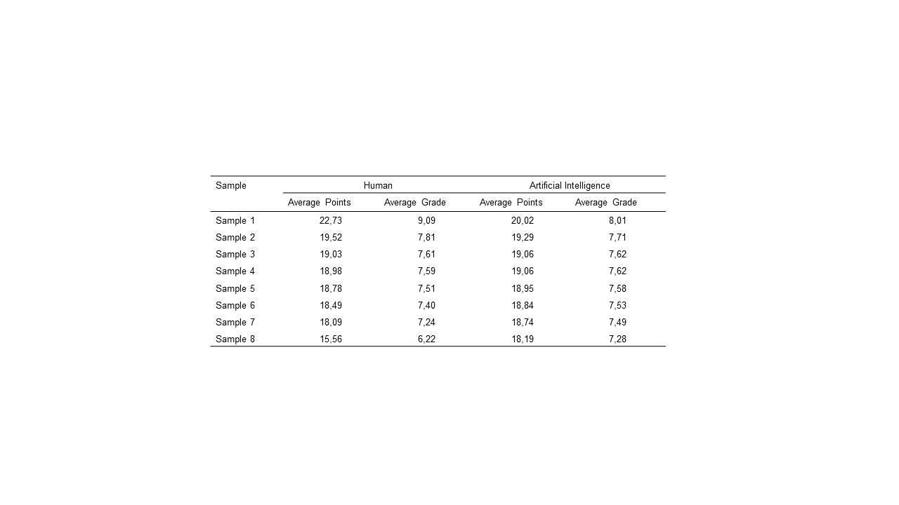 Additionally, some important information can be extracted by comparing participants’ grades. First, only two students outperformed at least one AI sample. Second, only one student scored above 9; however, only one student scored below 7, which is a non-passing grade in this context. Most grades (n = 13) were in the 7 to 8 band, which, as seen before, indicates a low level of dispersion. Table 2 compares human and AI scores from the highest to the lowest.