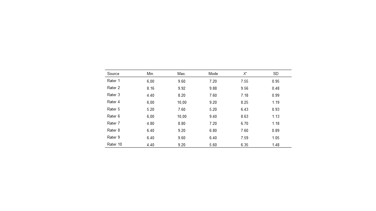 In addition, the standard deviation, coupled with the other data, reveals crucial information. For example, Rater 2 has the lowest standard deviation and the high scores. This trend suggests that this professor consistently tends to grade students less severely than other colleagues. In contrast, Rater 5 presents consistent but more severe behavior when grading. Finally, Rater 10 has the highest level of dispersion when grading; however, the given grades tend to score low but acknowledge certain students’ written work.