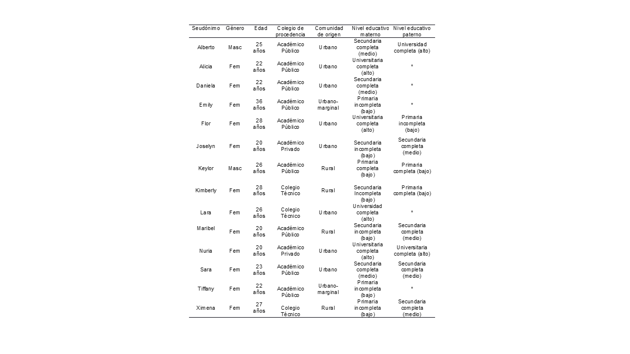 En un principio, se buscaron participantes que procedieran de hogares donde las madres y los padres tuvieran un bajo nivel educativo (i.e., secundaria incompleta o menos), con el fin de entender cómo, incluso en situaciones de desventaja social, las personas participantes lograron ingresar a la universidad. Sin embargo, y con el fin de contrastar con las experiencias de estudiantes provenientes de hogares de bajos recursos, en la muestra se incluyeron estudiantes provenientes de hogares relativamente aventajados; es decir, de nivel educativo medio (i.e., padres con secundaria completa) y nivel educativo alto (i.e., padres con estudios universitarios). La Tabla 1 describe las características sociodemográficas de cada una de las personas participantes en el estudio.