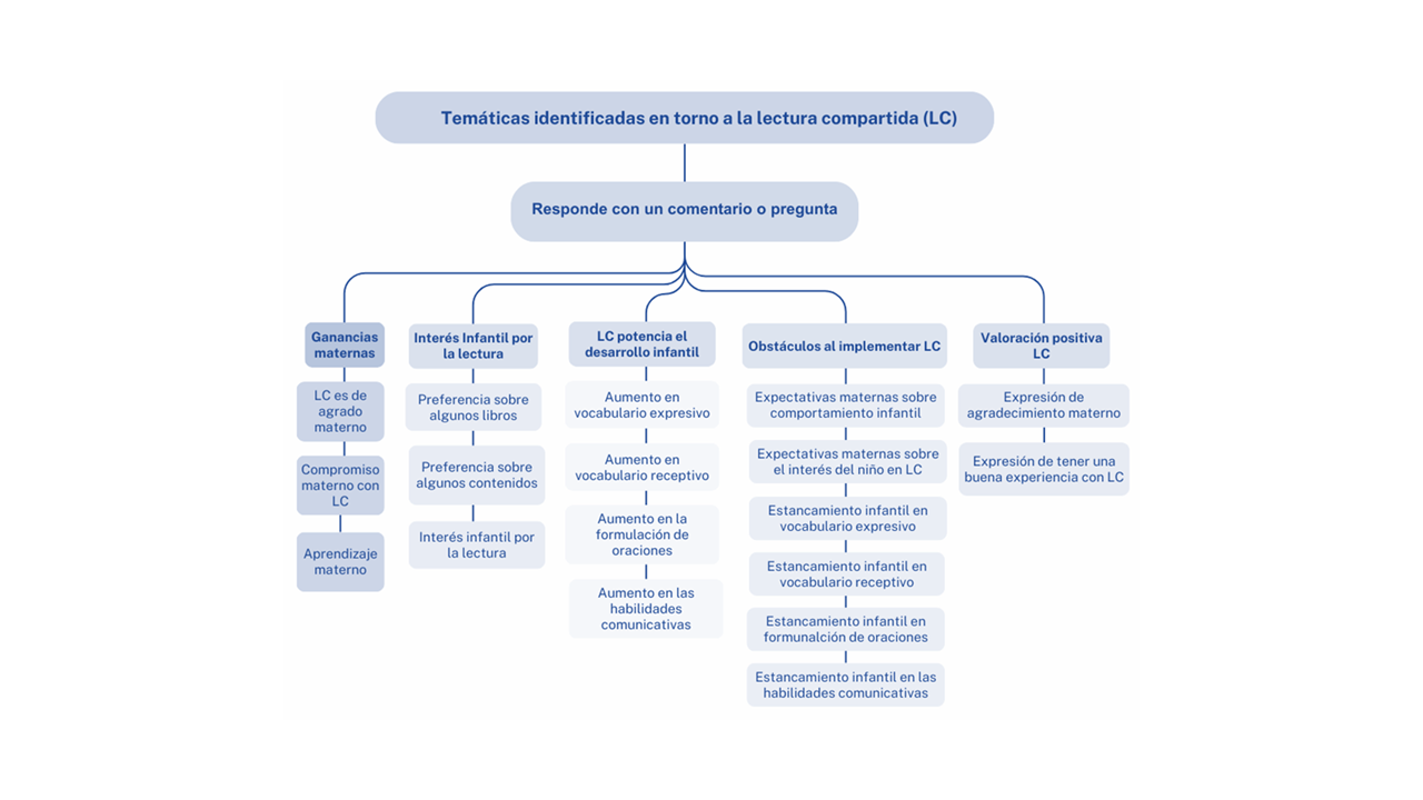 El análisis de contenido de las respuestas proporcionadas por las madres ante los mensajes de texto brindados desde el proyecto arrojó cinco grandes temáticas que son descritas en la figura del Anexo 4 y que hacen referencia a los elementos facilitadores y las barreras encontradas durante la implementación de la lectura compartida. La primera gran temática se refiere a la valoración positiva de la experiencia materna. Esta categoría incluyó expresiones maternas de gratitud hacia el proyecto, que van más allá de un simple “Gracias”, las cuales funcionan como reconocimiento de haber recibido un mensaje, como por ejemplo: “Muchas gracias, nos encantaron los libros, mil gracias” o “Estamos muy agradecidos, gracias por los materiales e información.” Estas expresiones de gratitud han sido identificadas en otras evaluaciones parentales de programas de promoción de lectura compartida similares y realizados en otras latitudes. En su estudio con padres de familia de la comunidad latina en Estados Unidos, Jimenez et al. (2020) observaron que una temática recurrente en las valoraciones de padres y madres se refería a la expresión de gratitud hacia las personas profesionales de la salud que les brindaron libros infantiles y consejos sobre cómo llevar a cabo la lectura compartida como parte del programa de promoción de lectura Reach Out and Read (ROR), que toma lugar en clínicas pediátricas.