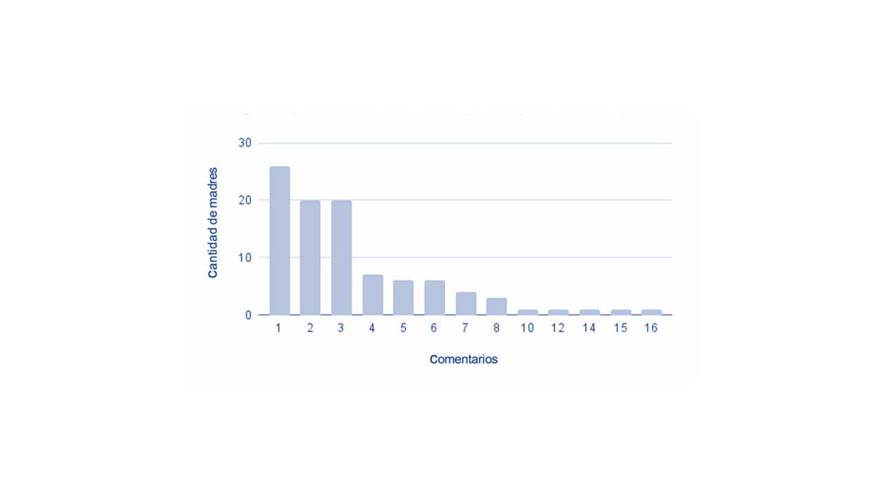 La exploración más detallada del comportamiento del 60.7 % (n = 102) de madres que respondieron al menos una vez con comentarios o preguntas indica que este subgrupo emitió entre 1 y 33 respuestas, con una media de 8.19 respuestas (DE = 7.13). La mediana de respuestas fue de 6 mientras que la moda fue de 1.