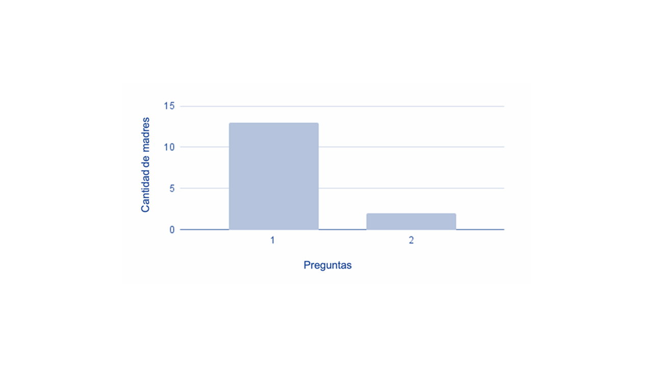 Con el fin de comprender mejor el tipo de interacción de las madres con la aplicación, se analizaron las frecuencias de respuesta materna de manera separada para los comentarios y las preguntas. La Figura 1 indica que del total de madres que enviaron comentarios (n = 95), la mayoría (69.47%, n = 66) envió comentarios entre una y tres ocasiones, mientras que un reducido grupo de madres (5.26 %, n = 5) envió una mayor cantidad de comentarios, entre 10 y 16 mensajes. De igual manera, la Figura 2 muestra que del total de madres que envió preguntas (n = 15), una proporción considerable formuló preguntas en una única ocasión (86.67%, n = 13), y una pequeña cantidad de madres (13.33%, n = 2) envió dos preguntas.