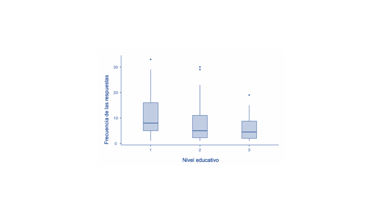 Un análisis de Kruskal-Wallis realizado con las 102 madres que respondieron al menos una vez con un comentario o pregunta a los mensajes de texto enviados reveló la presencia de diferencias estadísticamente significativas en la cantidad de respuestas según el nivel educativo materno (χ2 = 8.8, p = 0.01). Un análisis post hoc mediante la prueba Dwass-Steel-Critchlow-Fligner (DSCF) reveló una diferencia estadísticamente significativa entre la cantidad de respuestas de madres sin secundaria completa y madres con educación universitaria completa o más (W = - 4.23, p = 0.008). Este hallazgo se visualiza en la Figura 3, donde se aprecia que las madres sin educación secundaria completa presentaron una mediana de respuestas mayor en comparación con las madres con educación universitaria completa o superior.