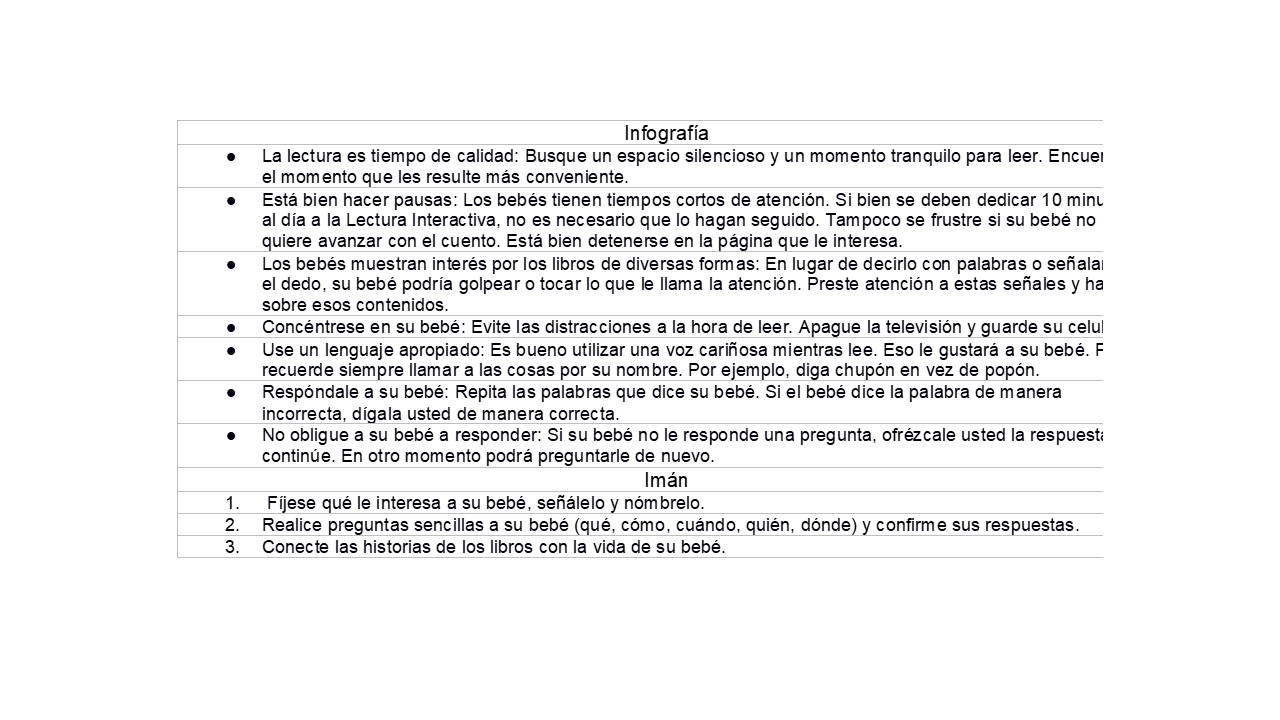 La intervención en lectura compartida incluyó una bolsa con cinco libros infantiles, una infografía con ocho recomendaciones sobre cómo practicar lectura compartida y un imán que describía tres estrategias a utilizar durante la lectura compartida. Todas las madres recibieron el mismo lote de libros, estos fueron seleccionados según la edad del grupo infantil participante del proyecto y combinaban palabras e imágenes para construir el sentido, con textos breves y grandes ilustraciones. Además, eran pequeños y de material resistente, lo cual permitió una fácil manipulación, dos de ellos incluían solapas que se abrían para promover una mayor interacción. Las temáticas abarcadas en los libros fueron seleccionadas a partir del contenido del instrumento utilizado en el proyecto para evaluar el vocabulario infantil (Jackson-Maldonado et al., 2013). Estas incluyeron rutinas de cuido, animales, relación entre personas cuidadoras e infantes, alimentos y partes del cuerpo. El Anexo 2 detalla el contenido de la infografía y del imán. El paquete de libros infantiles incluyó los siguientes títulos: Brown (2014), Carle (2019), Katz (2004), Murphy (2008) y Santoro (2016).