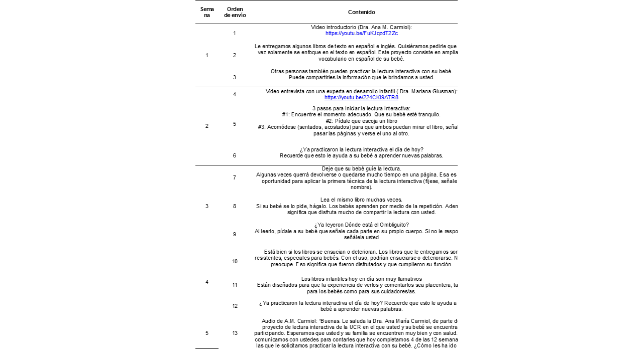 Durante el período de 12 semanas, las madres recibieron un total de 36 mensajes (3 por semana, enviados los lunes, miércoles y viernes), en formato de texto, audio y video, entregados a través de la aplicación WhatsApp. Los mensajes fueron enviados por cuatro asistentes de investigación que no participaron en la evaluación de las díadas durante la línea base ni en el postest. Los mensajes incluyeron un video introductorio sobre cómo practicar la lectura de libros, dos videos de expertas en desarrollo infantil quienes explicaron los beneficios de la lectura compartida, 30 mensajes de texto escritos, que reforzaban el contenido proporcionado en los videos, y tres mensajes de audio que guiaban el progreso durante la intervención. La información en los mensajes de texto combinaba técnicas basadas en el modelaje de comportamientos mediante la presentación de madres reales leyendo libros con infantes, técnicas basadas en la información sobre la importancia de la lectura compartida para promover el desarrollo del vocabulario temprano, así como la promoción de la práctica y la identificación de barreras y su solución. Estas técnicas de cambio de comportamiento han demostrado ser efectivas con personas cuidadoras (Michie et al., 2009). Durante el diseño de la intervención y previo a su implementación, el contenido de los mensajes fue validado por un grupo de 10 expertas en desarrollo infantil de Costa Rica y América Latina, quienes proporcionaron comentarios sobre la accesibilidad, claridad, integralidad y adecuación cultural del contenido. El Anexo 3 describe todos los mensajes enviados durante la intervención.