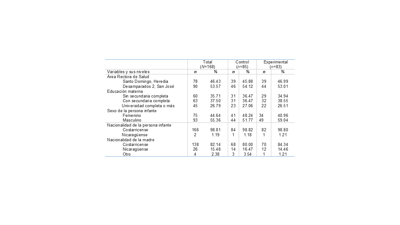 Para obtener los datos sociodemográficos de la muestra se utilizó la información recolectada a través de un cuestionario que fue completado en la línea base de la intervención, por medio del cual se solicitó información como la siguiente: fecha de nacimiento de madre e infante, el sexo de la persona infante, nacionalidad de madre e infante y su nivel educativo. Además, durante la sesión de la línea base las madres realizaron el proceso de consentimiento informado con alguna persona investigadora del proyecto. La educación materna se clasificó a partir de tres niveles (1 = sin secundaria completa, 2= con secundaria completa y 3 = con universidad completa o más).