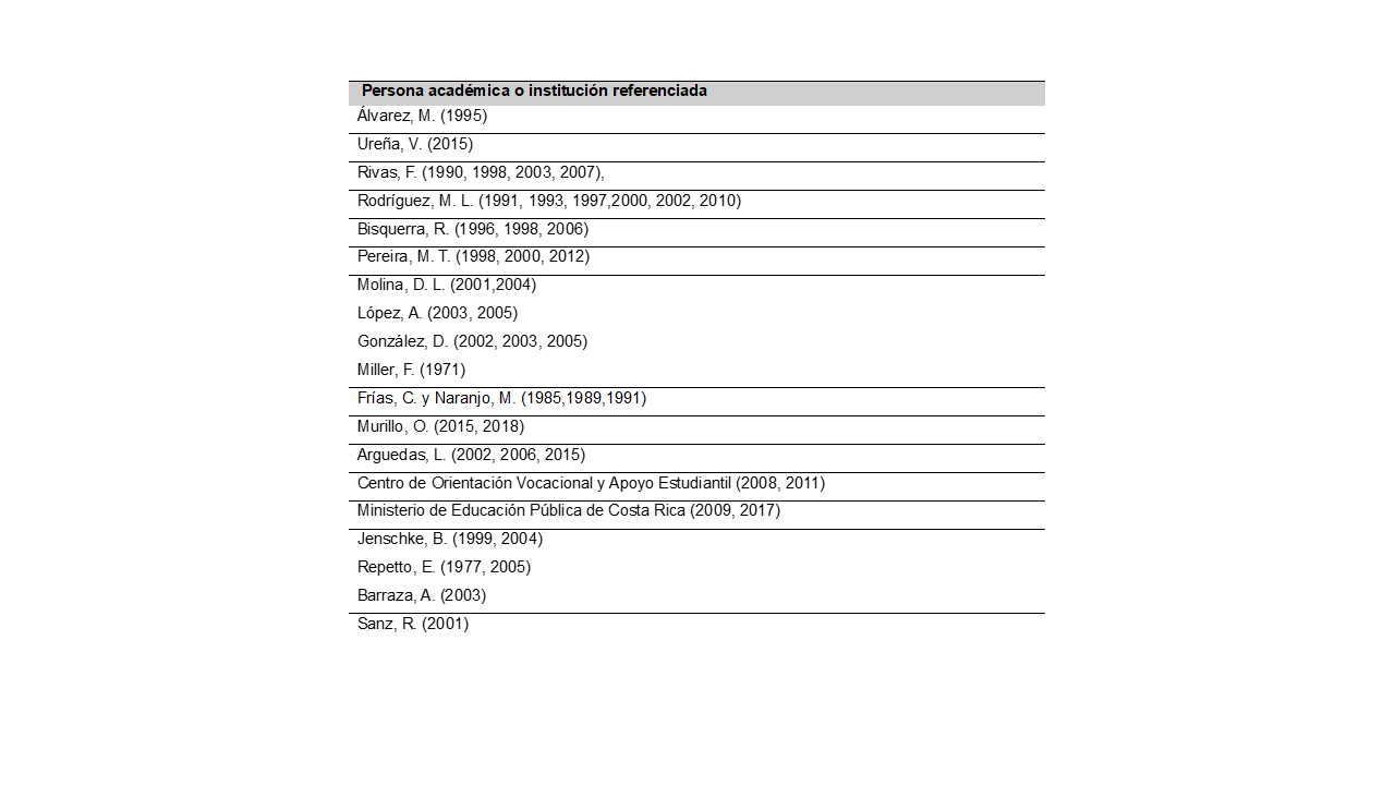 Es importante resaltar que la Tabla 5 incluye a algunas personas académicas costarricenses que han investigado y publicado en temáticas relacionadas con lo vocacional, por ejemplo: Carmen Frías, Osvaldo Murillo y Josué Jiménez.
