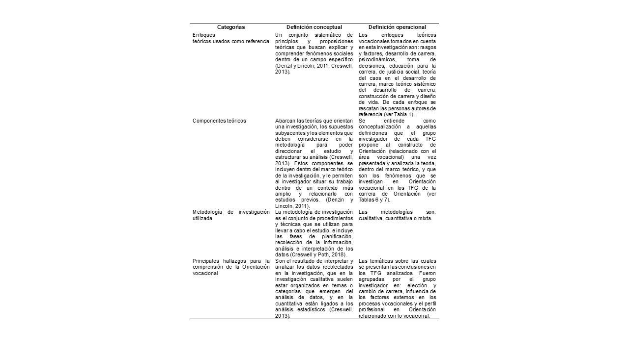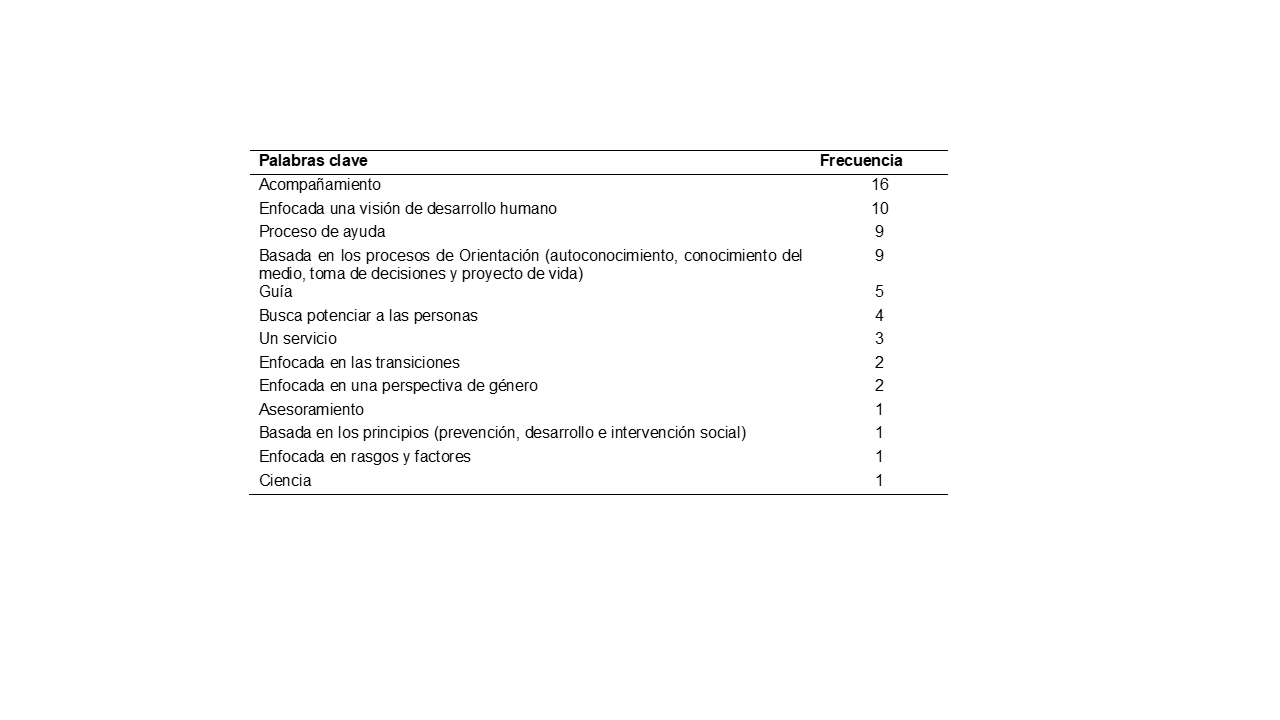 Se entiende como conceptualización a aquellas definiciones que el grupo investigador de cada TFG propone al constructo de Orientación, una vez presentada y analizada la teoría, dentro del marco teórico. Esas conceptualizaciones, para efectos del estudio, se codificaron en palabras clave relacionadas con el énfasis del área vocacional (Tabla 6).