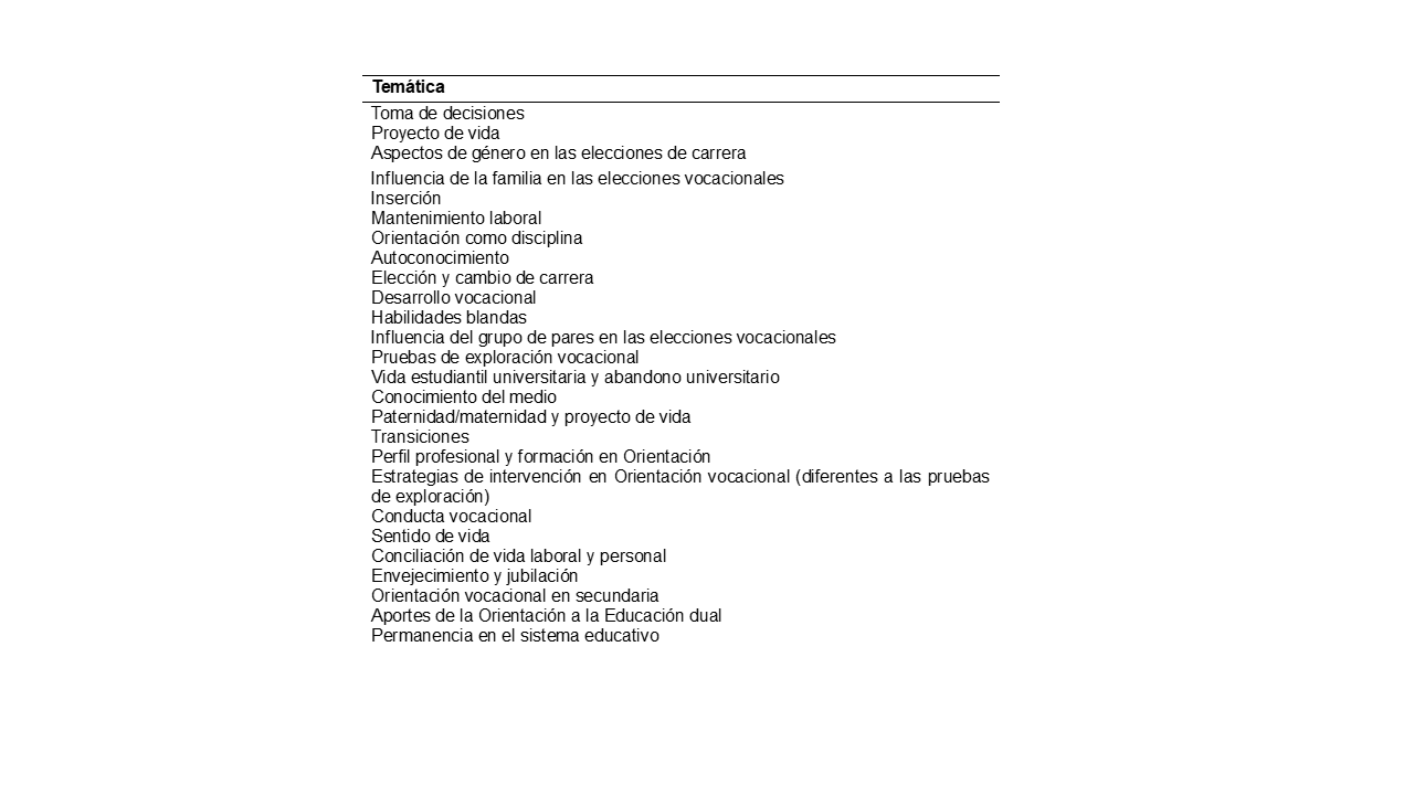 La información citada demuestra que estas temáticas han sido las principales líneas de investigación en el ámbito vocacional desarrolladas en la carrera de Orientación durante los últimos doce años. También, se hallaron líneas temáticas menos estudiadas: las habilidades blandas y para la vida, el estudio de la validez y confiabilidad de pruebas de exploración vocacional, así como la conciliación entre la vida laboral y familiar. Se recomienda que la carrera de Orientación valore la pertinencia de darle continuidad a las líneas temáticas expuestas, con el fin de afianzar el conocimiento producido por la carrera y, a su vez, integrar nuevas perspectivas que respondan a las demandas actuales del contexto social y laboral.
