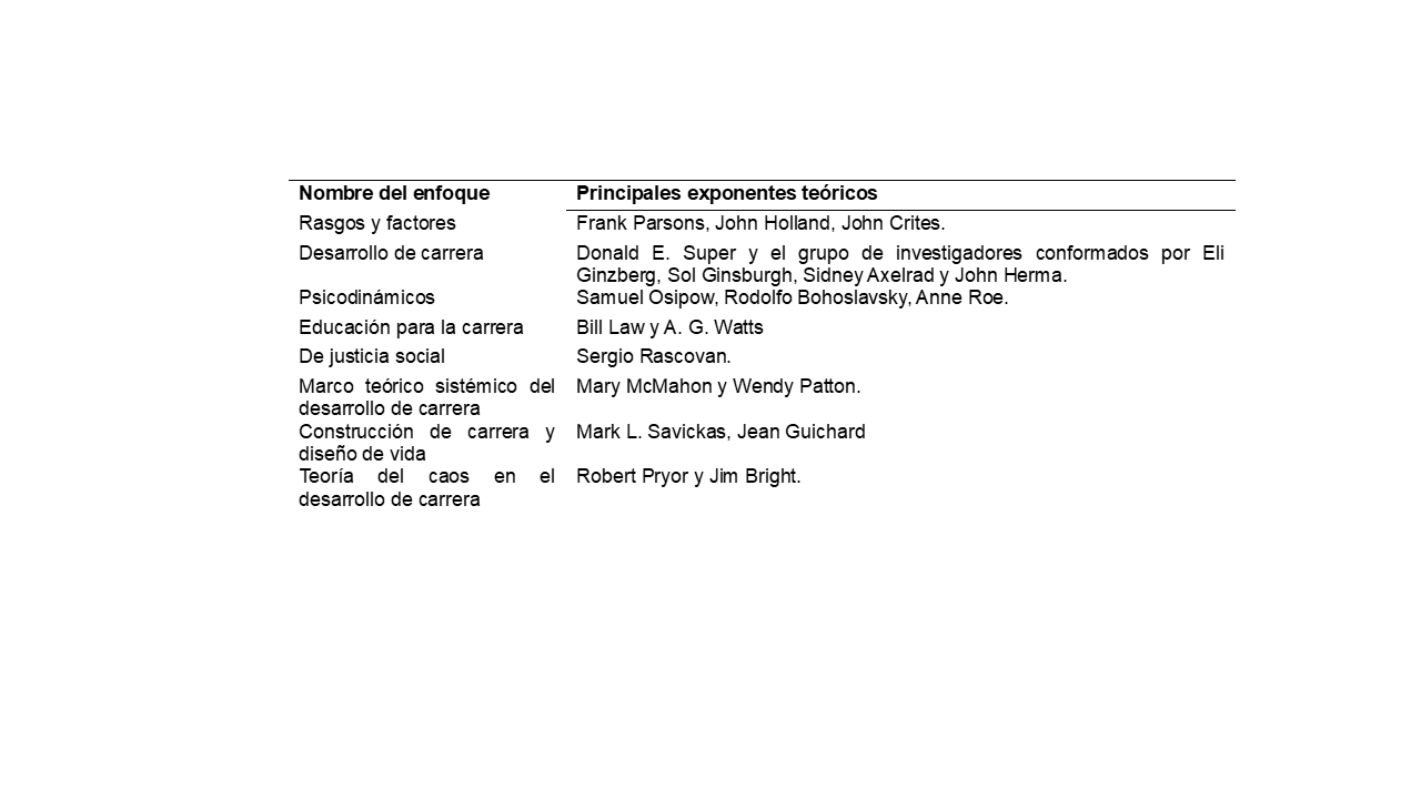 Existen diversas clasificaciones de los enfoques teóricos desarrollados en la disciplina de la Orientación a través de los años. A partir de la integración de al menos cuatro propuestas diversas de clasificaciones, el grupo investigador presenta un listado de los enfoques teóricos de Orientación vocacional en la Tabla 1. Se consideraron propuestas originadas en Latinoamérica y Norteamérica; además, se parte de la integración de la académica costarricense Ureña Salazar, quien se basa en las propuestas de autores como Álvarez et al. (1995, citado en Ureña, 2015, p. 215).