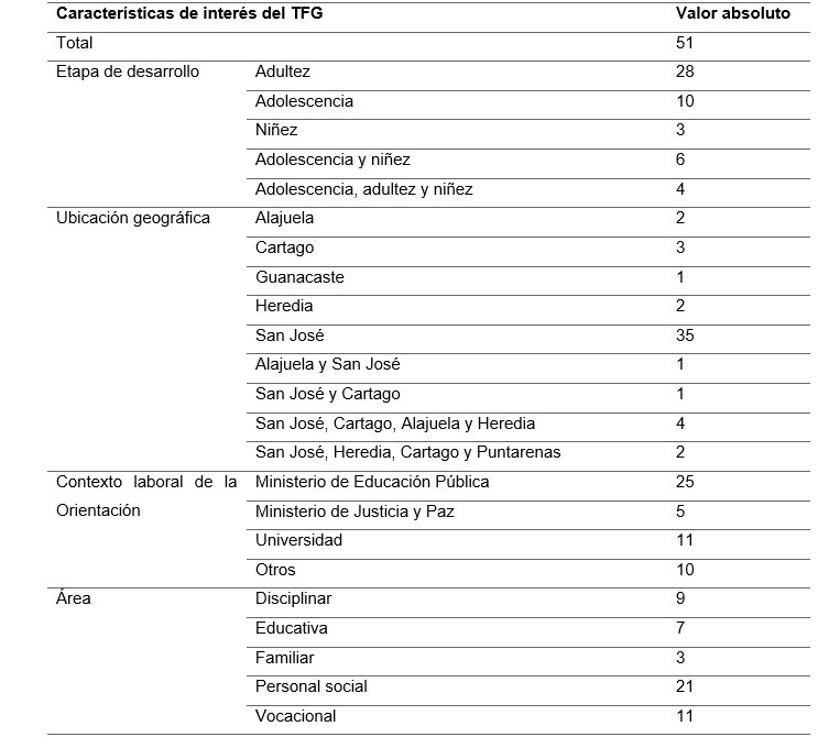 Durante el periodo de estudio (2012-2023) en el Bachillerato y Licenciatura en Ciencias de la Educación con énfasis en Orientación que imparte la UCR se realizaron 51 TFG, y es el área Personal Social desde la cual se realizaron más estudios. La mayoría de las personas participantes se ubica en la etapa de desarrollo de la adultez, provenientes de la provincia de San José y en el contexto laboral del MEP.