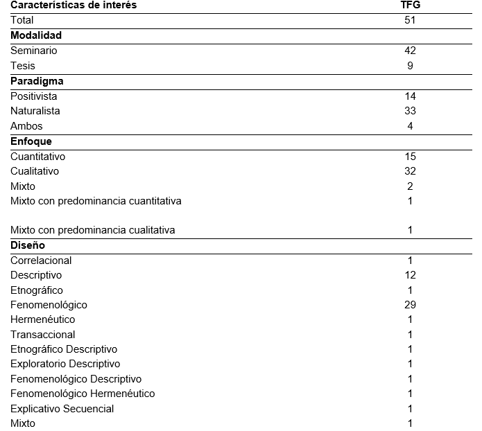 Respecto a los aspectos metodológicos desde los cuales se realizaron los TFG, con mayor frecuencia se hacen desde el paradigma de investigación naturalista y en consonancia con este, desde el enfoque cualitativo y el diseño fenomenológico. Finalmente, la modalidad más utilizada es la de seminario de graduación, con 42 investigaciones.