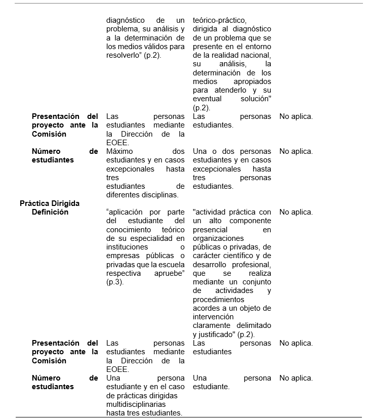La práctica dirigida consiste en la puesta en práctica del conocimiento teórico de la disciplina en instituciones y organizaciones del entorno social (UCR, 1980), con una alta presencialidad y desarrollando actividades y procedimientos en relación con un objeto de intervención delimitado y justificado (UCR, 2020b). La propuesta para su ejecución, de acuerdo con la normativa de 1980, es presentada por la persona estudiante (en prácticas multidisciplinarias hasta tres estudiantes) a la Dirección de la Escuela y, en la versión del 2020, también por la persona estudiante; no obstante, no se permite más de una persona.