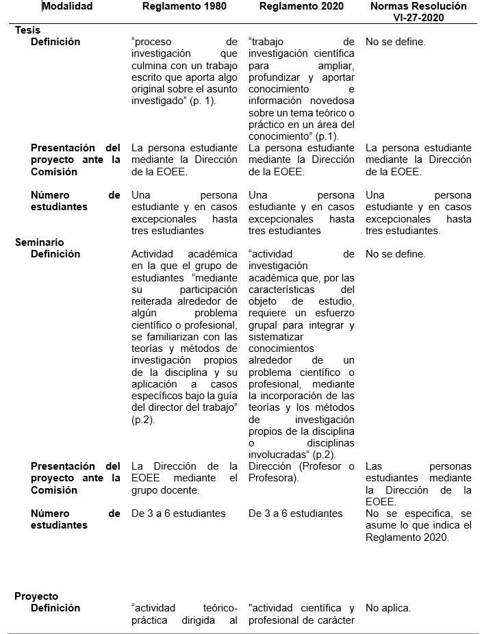 Dado el periodo que abarca este estudio, en la Tabla 1 se compara las versiones de 1980 y de 2020 del Reglamento, así como, las Normas complementarias para la elaboración del Trabajo Final de Graduación de la Licenciatura en Orientación y Educación Especial. Específicamente, se presentan las diferencias y similitudes en cuanto a definiciones, personas que presentan la propuesta y número de estudiantes por modalidad. Lo anterior permite conceptualizar cada modalidad a partir de la normativa indicada anteriormente y comprender su importancia en el contexto del estudio.