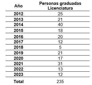 Respecto a la cantidad de las personas graduadas de la carrera de Orientación, en la Tabla 2 se describe que, durante el periodo en estudio, se han graduado 235 estudiantes en la Licenciatura, lo que supone que han realizado su TFG.