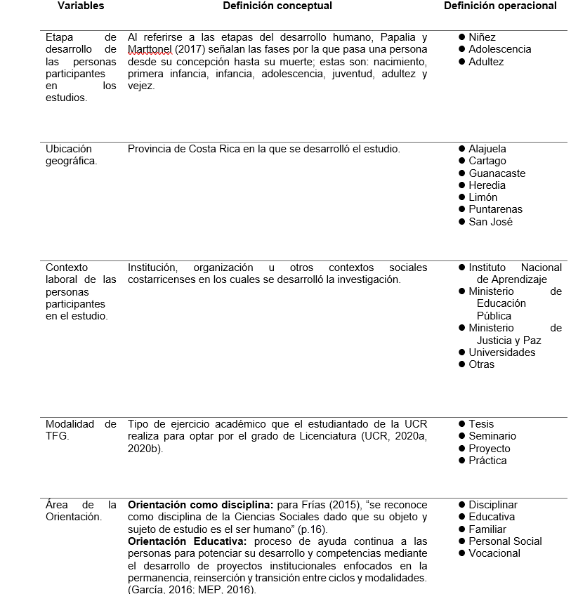 El análisis realizado fue descriptivo, dado que tiene la “capacidad para seleccionar las características fundamentales del objeto de estudio y su descripción detallada de las partes, categorías o clases de ese objeto” (Cerda, 1998, citado en Bernal, 2010, p. 113). Con este análisis, se pretende brindar un panorama general acerca de las características de la investigación realizada durante el periodo 2012-2023 mediante los TFG en la carrera de Orientación de la UCR.