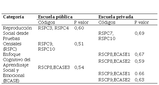 La categoría Reproducción Social desde Pruebas Censales, indicó diferencias entre el alcance del papel formativo de las instituciones frente a aspectos claves para el ingreso al mundo laboral. En el caso de la creatividad, fue valorada por el estudiantado de la escuela privada como motivación para el ingreso a la educación superior, aunada a la conciencia de clase y una buena formación en HSE (