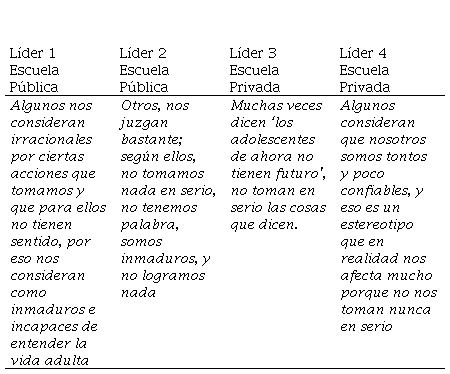 Desde las entrevistas, los líderes de ambas instituciones expresaron que las personas adultas, tanto del entorno escolar como familiar los tomaban en serio al considerar sus puntos de vista como valiosos, no obstante al pasar al colectivo adolescente aludieron diversos prejuicios que menoscababan sus posibilidades para poder ser considerados como parte del mundo de los mayores centrados todos ellos en la desconfianza hacia su criterio (Tabla 4).