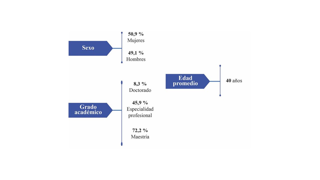 A continuación, se presentan las características de las personas graduadas de posgrado de los años 2017-2019 que llevan a cabo investigación. De manera general, muestran una distribución por sexo equitativa y son en su mayoría personas que cuentan con maestría (72,2 %) y especialidades profesionales (45,9 %), y tienen una edad promedio de 40 años, tal como se visualiza la Figura 2. Cabe destacar, como lo afirma Ortega et al. (2017), que a las instituciones de educación superior les corresponde el papel en el desarrollo de competencias científicas, lo cual involucra de manera indirecta la investigación.
