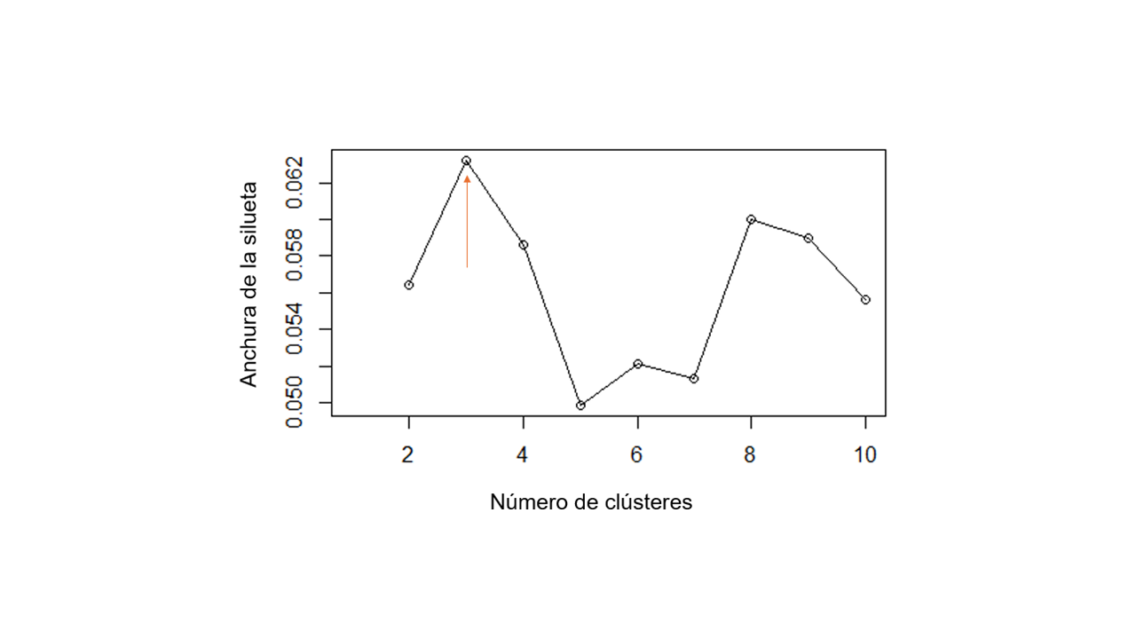 Por lo anterior se procede con la visualización de los datos por medio de un gráfico de silueta, pero teniendo en consideración el ajuste de las medidas de la distancia de Gower entre las personas graduadas de posgrado que realizan investigación y el salto promedio, medida seleccionada porque su valor es el más cercano a 1 entre los grupos conformados. En la Figura 3 se muestra el número de grupos (eje x) y el ancho de la silueta (eje y), se confirma que la cantidad de grupos que se generan son tres, dado que el punto más alto del gráfico se presenta en ese valor (flecha naranja en la Figura 3). Por otro lado, para profundizar la agrupación ver el Anexo 3.